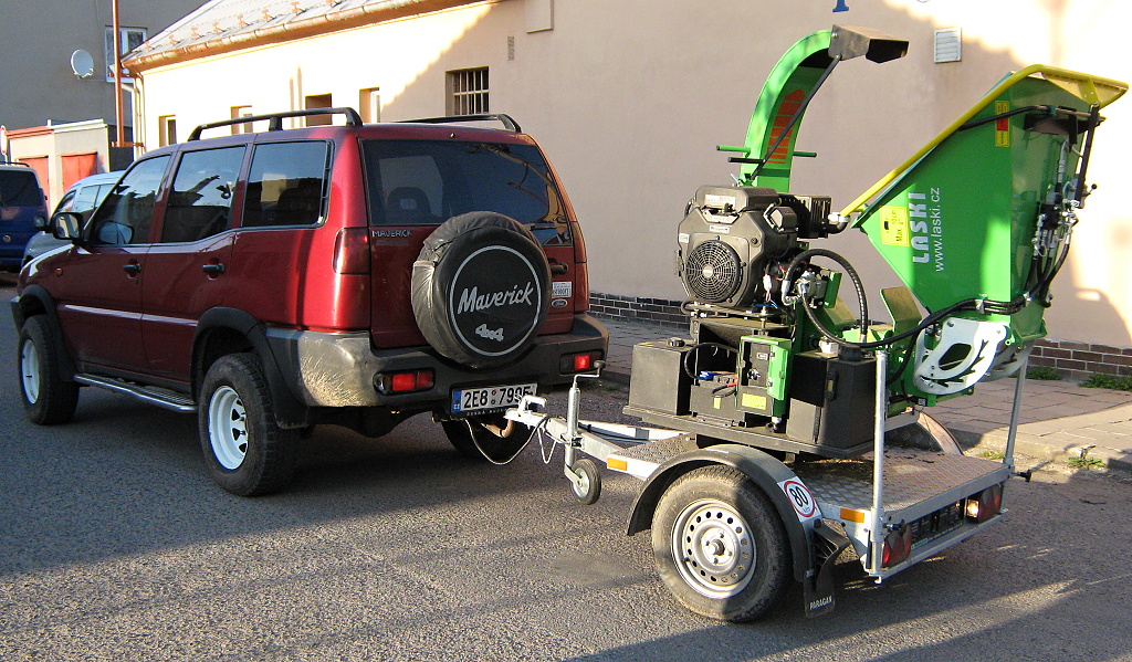 Praktické uložení štěpkovače na vozíku za terénní automobil umožní jeho přepravu téměř na jakékoliv místo.